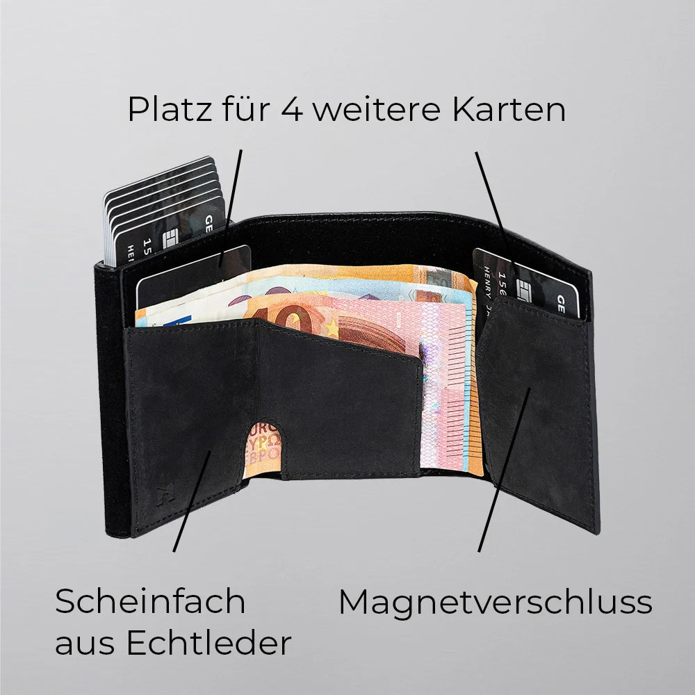 De kaarthouder is een toonbeeld van precisie en materiaalkeuze. Premium leer en een hoogwaardige aluminium behuizing komen samen in een verfijnd ontwerp waarin compactheid, duurzaamheid, elegantie en functionaliteit perfect in balans zijn. Ideaal voor wie houdt van minimalisme zonder concessies.
