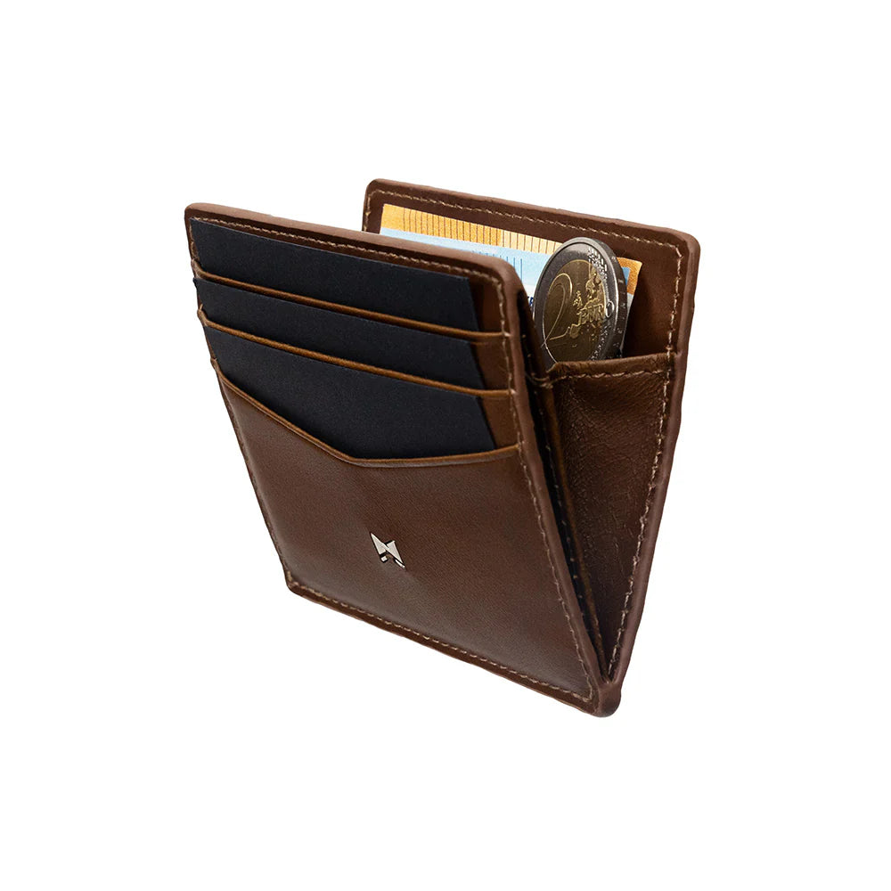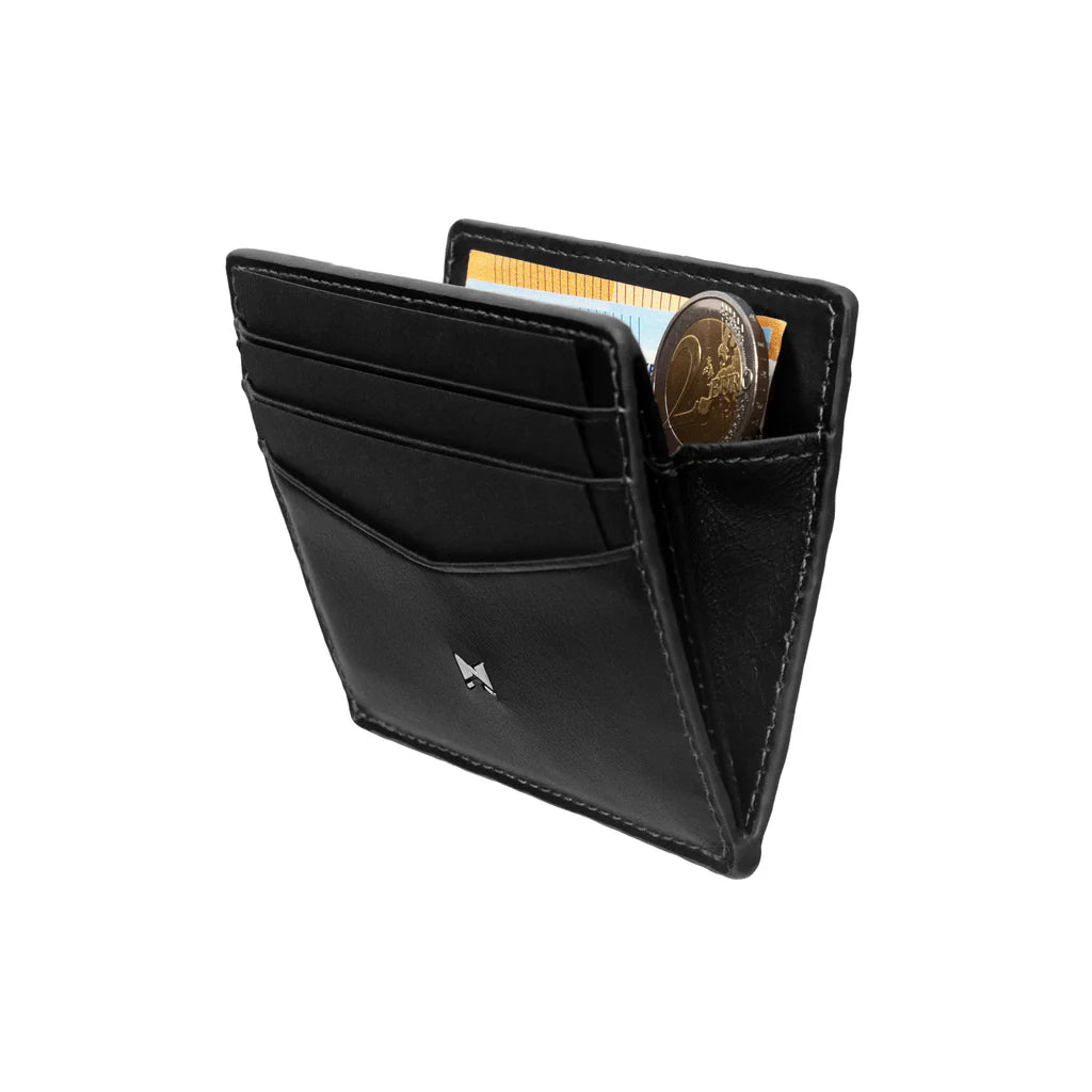 Met een dikte van slechts 1,1 centimeter behoort deze kaarthouder van Gentlemen’s tot de dunste portemonnees ter wereld. Het innovatieve, gepatenteerde vouw- en sluitmechanisme maakt het mogelijk om ondanks het slanke profiel verrassend veel mee te nemen, zonder in te leveren op comfort of uitstraling.