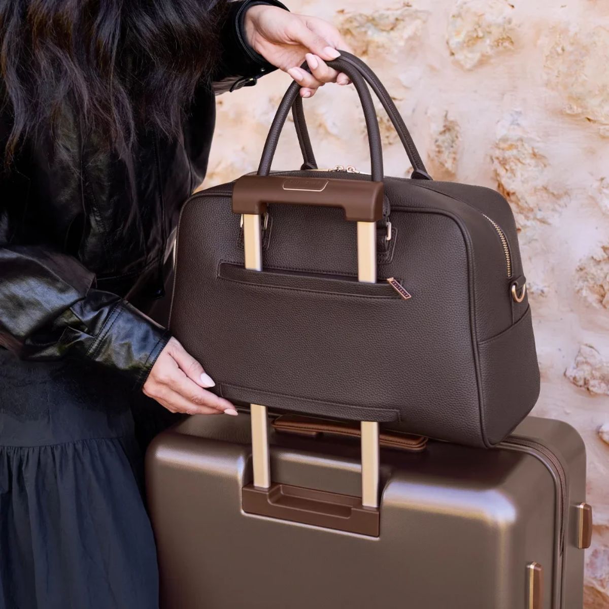 Het ruime hoofdvak sluit met een ritssluiting en biedt volop plek voor kleding, schoenen en andere essentials. Binnenin zorgen meerdere insteekvakken en een extra ritsvak ervoor dat uw spullen overzichtelijk opgeborgen blijven en u snel vindt wat u nodig heeft. De goudkleurige hardware vormt een elegante finishing touch en versterkt de luxe uitstraling van de tas.